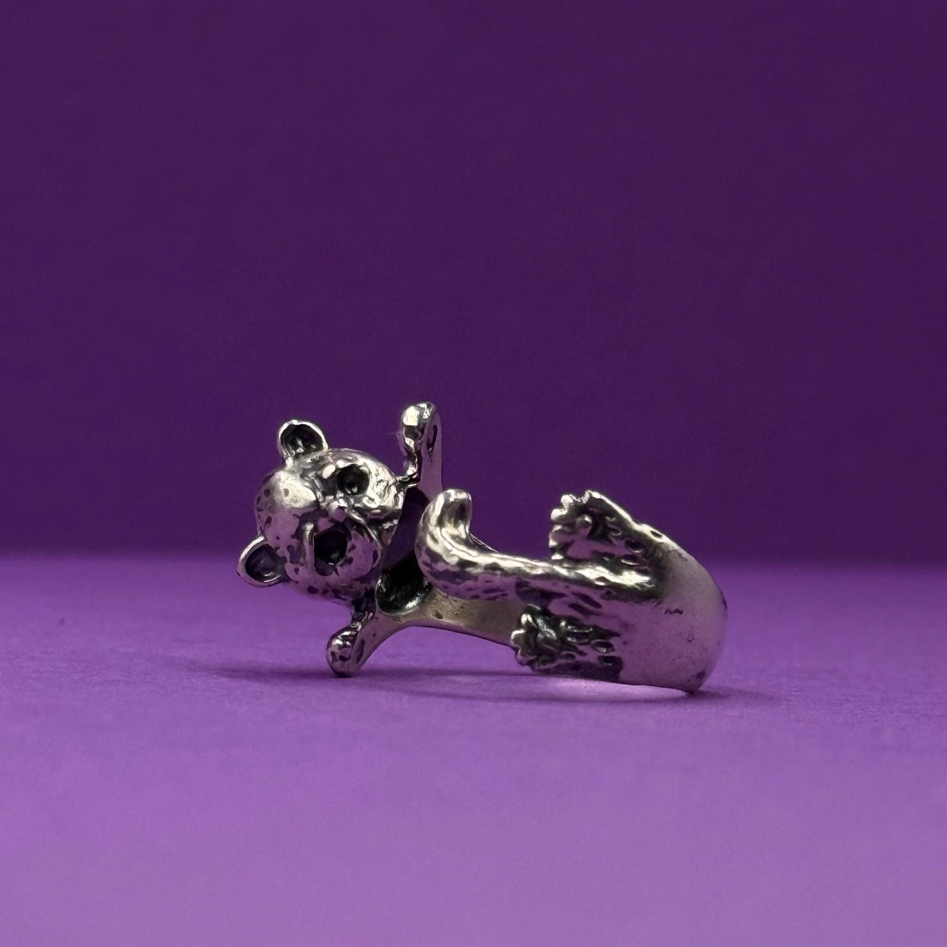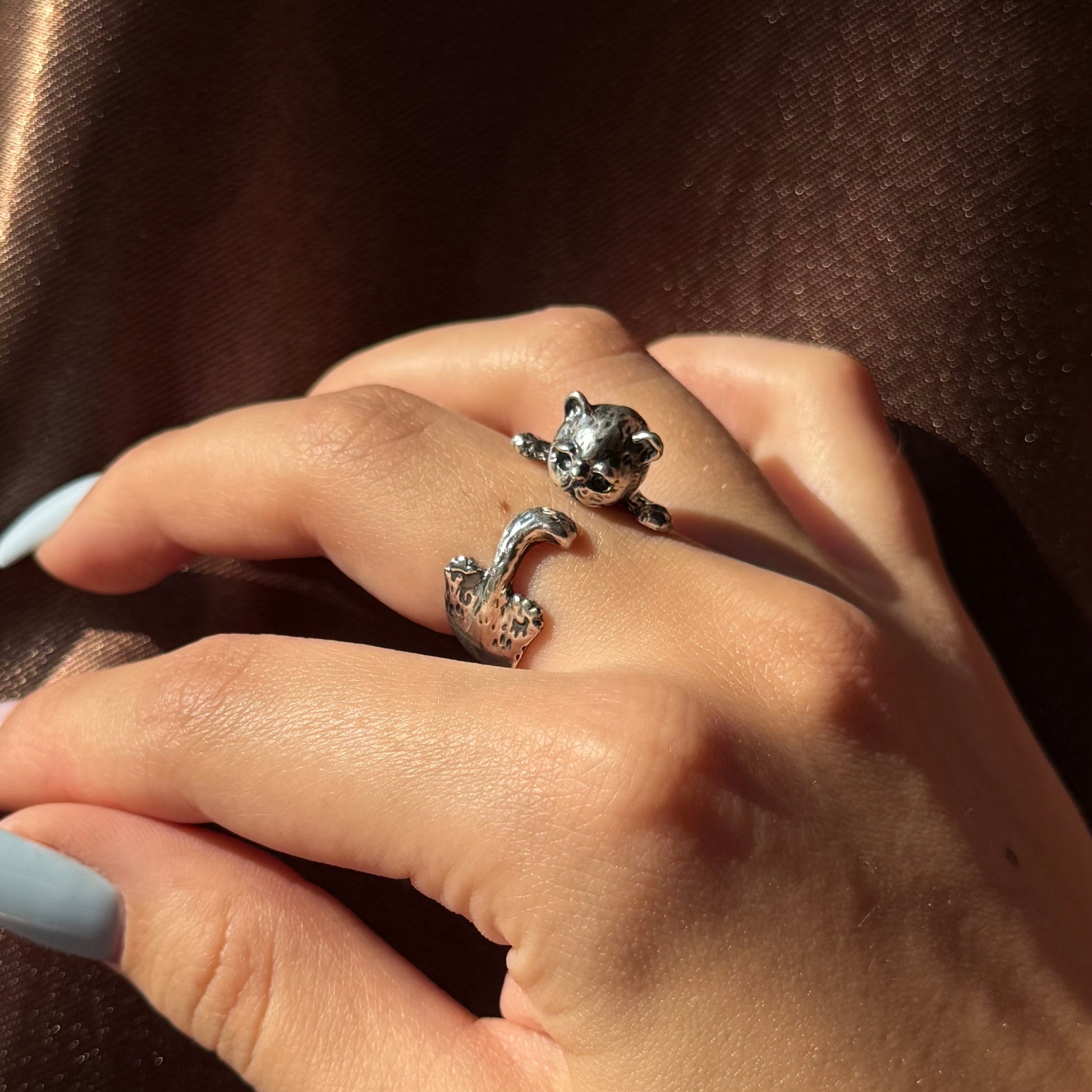 Adjustable handmade silver ring featuring a playful cat design. Fun, unique, and full of character, this ring is crafted by hand and fits most sizes thanks to its open adjustable band. A perfect accessory for those who love quirky, standout jewelry.