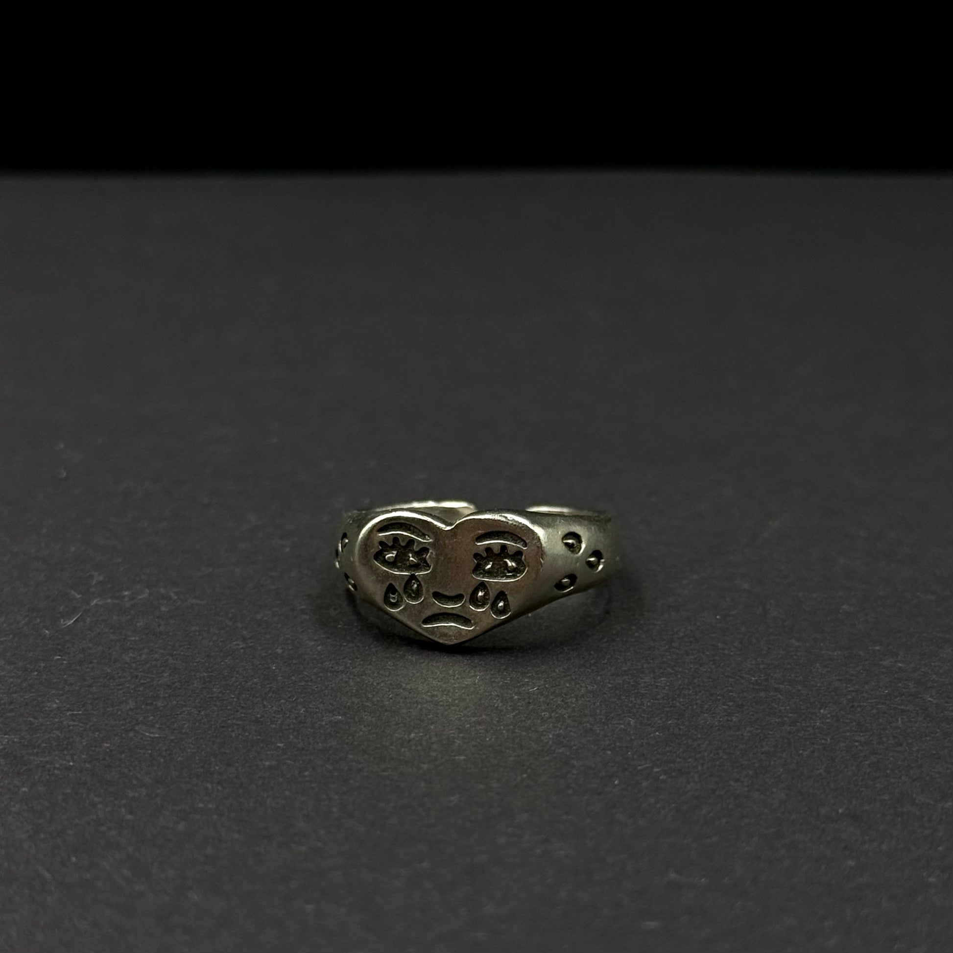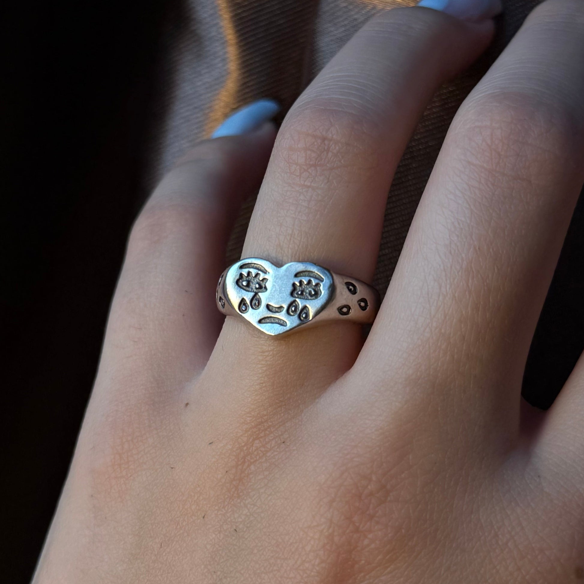 This handmade adjustable silver ring features a heart-shaped design with an engraved expressive face, symbolizing emotions and individuality. Its unique artistic style makes it stand out as a statement accessory, perfect for those who appreciate jewelry with meaning and personality. Each piece is crafted by hand, ensuring its originality and authenticity.