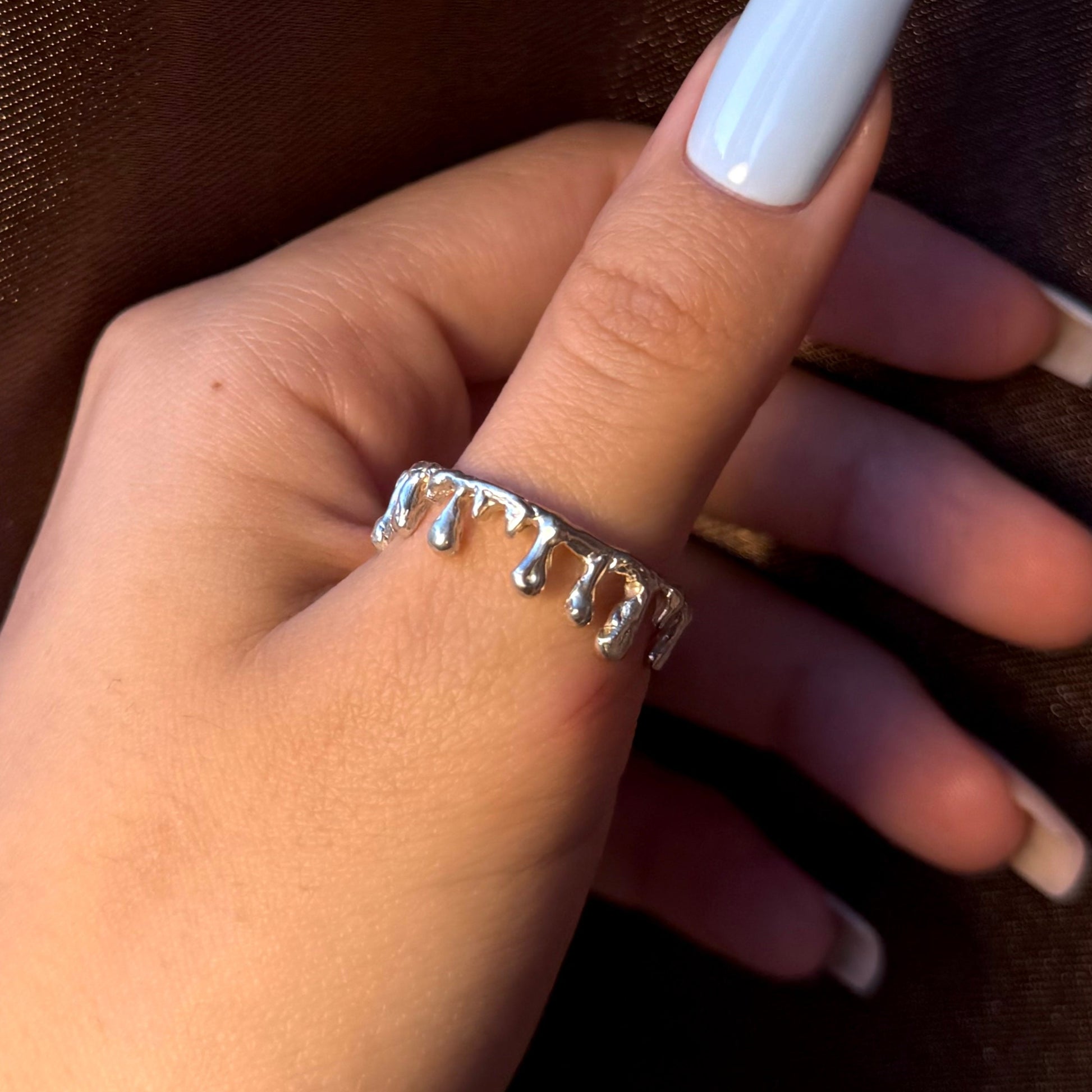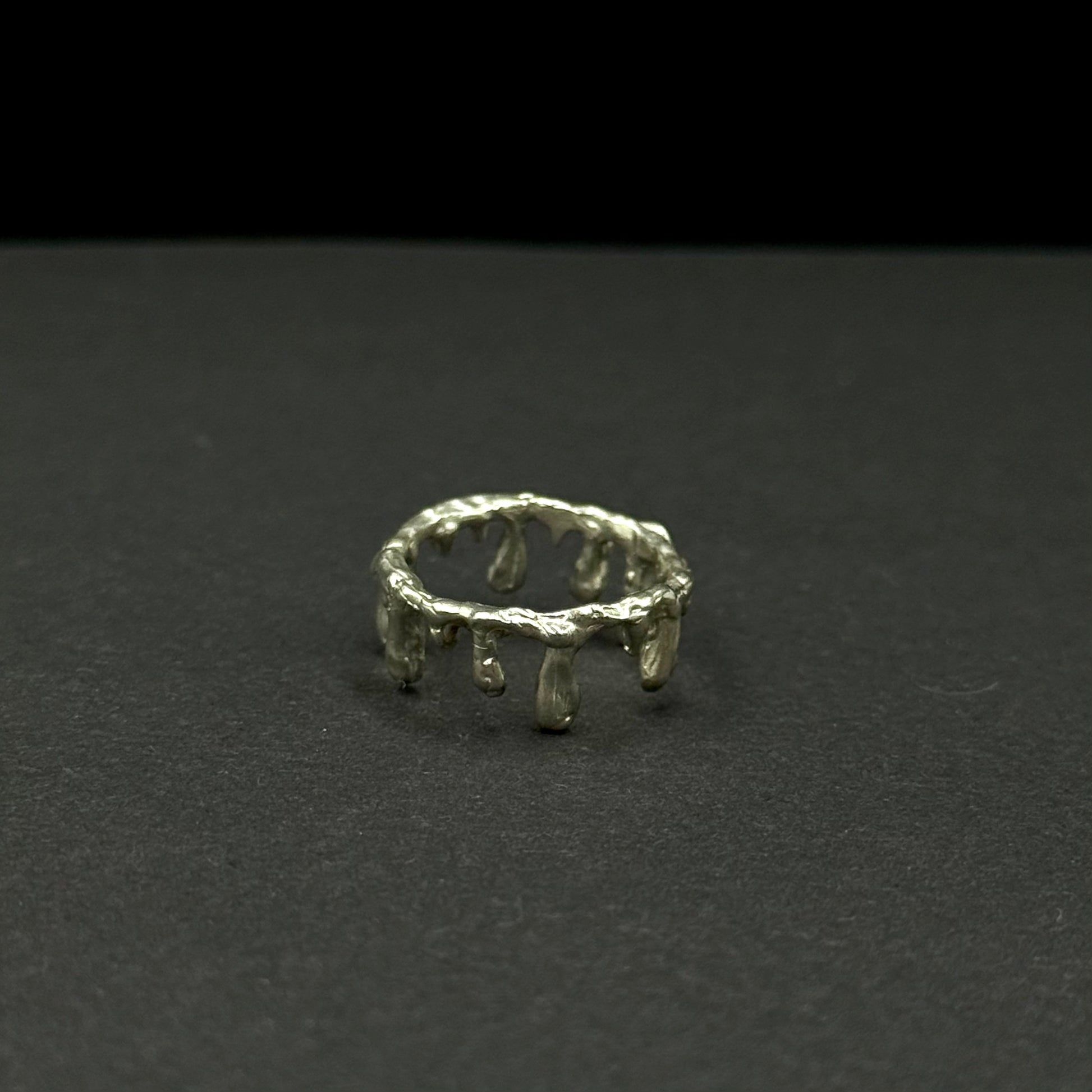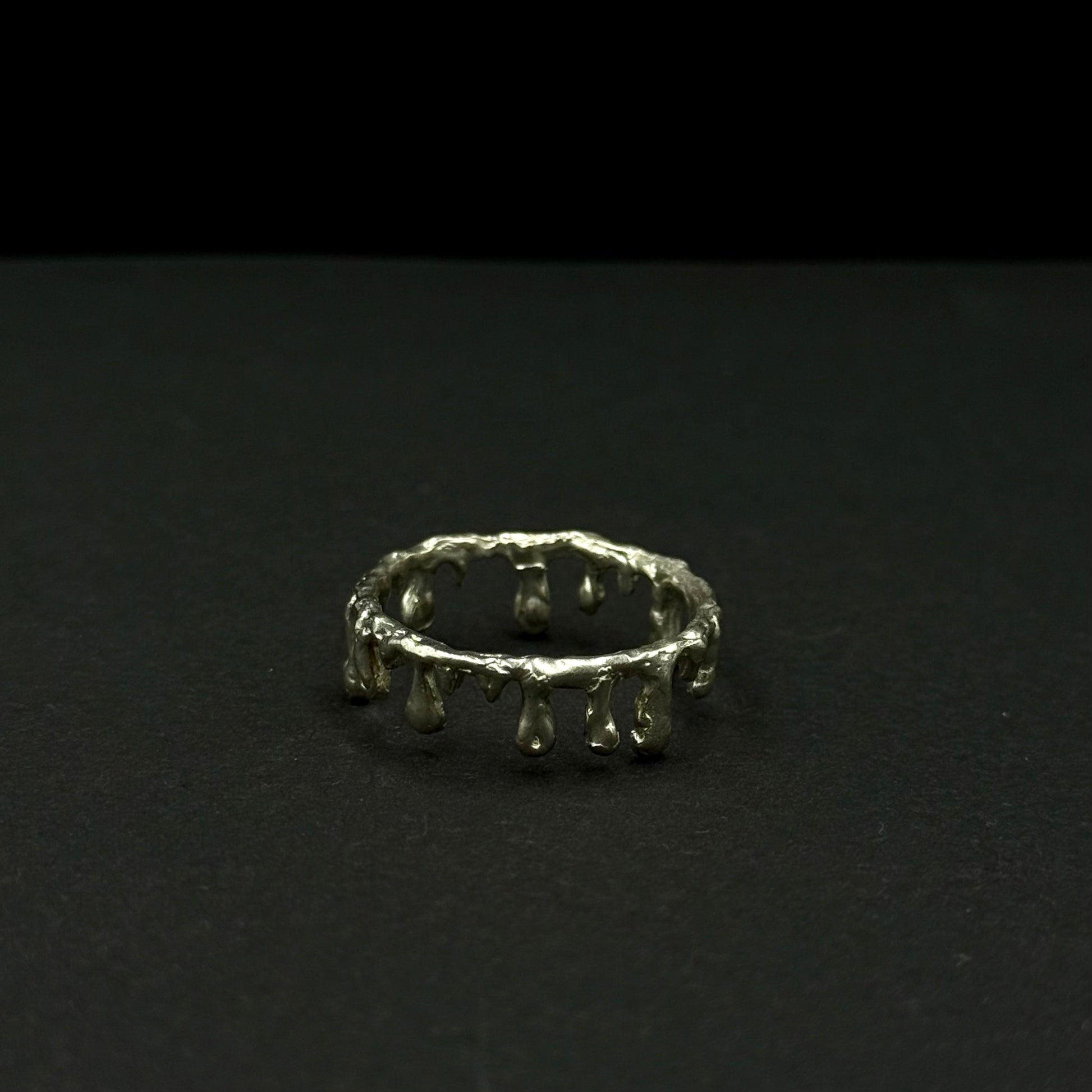 This striking handmade silver ring features a distinctive molten drip effect that gives it a raw, edgy aesthetic. Every drop-like detail is carefully shaped, making each ring one of a kind. Its unpolished texture enhances the artistic and rebellious style. Perfect for those who love jewelry that stands out, this piece brings a sense of individuality and bold character to any look.
