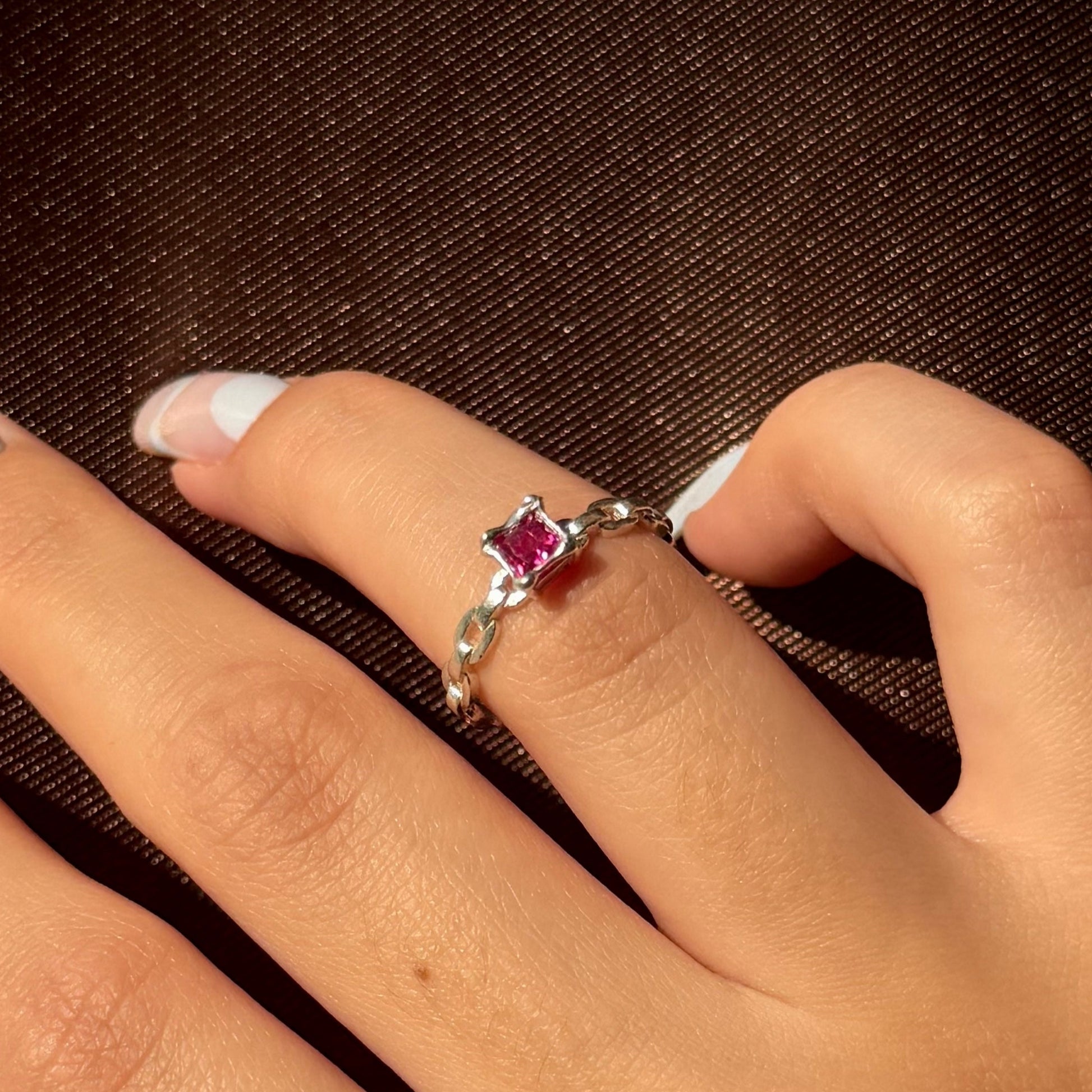 Handmade silver ring with a chain-link design, set with a square-cut cubic zirconia stone. Stylish and modern, this piece blends edgy aesthetics with timeless elegance. Each ring is individually crafted by hand, making it unique and one of a kind.