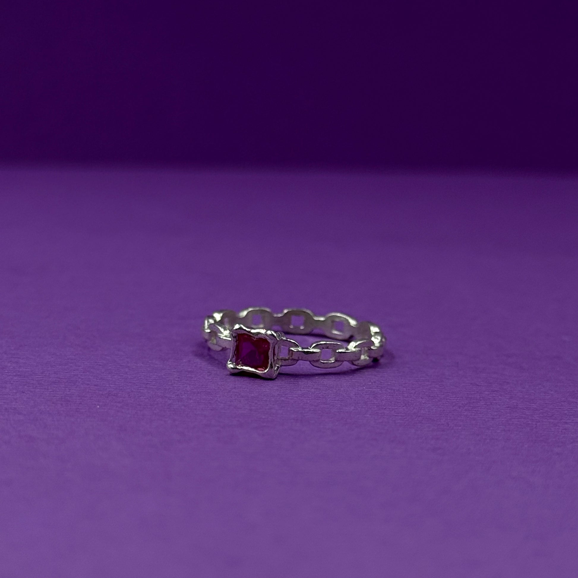Handmade silver ring with a chain-link design, set with a square-cut cubic zirconia stone. Stylish and modern, this piece blends edgy aesthetics with timeless elegance. Each ring is individually crafted by hand, making it unique and one of a kind.