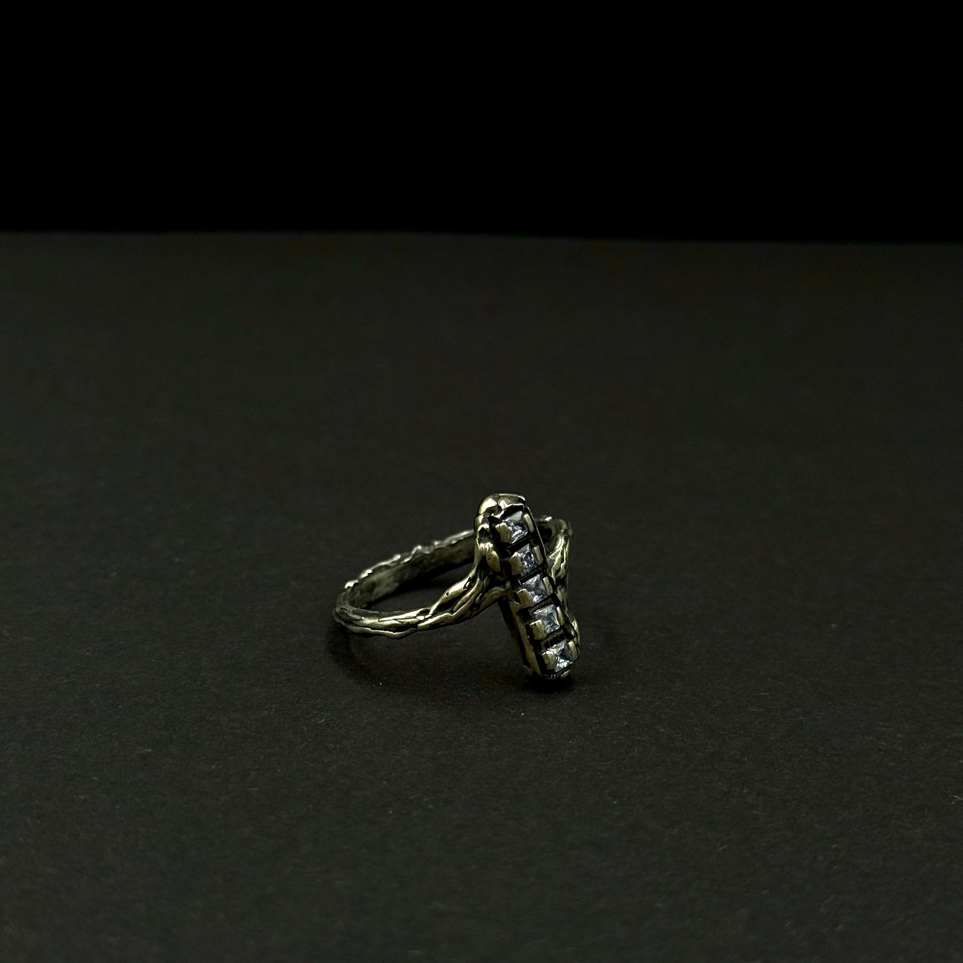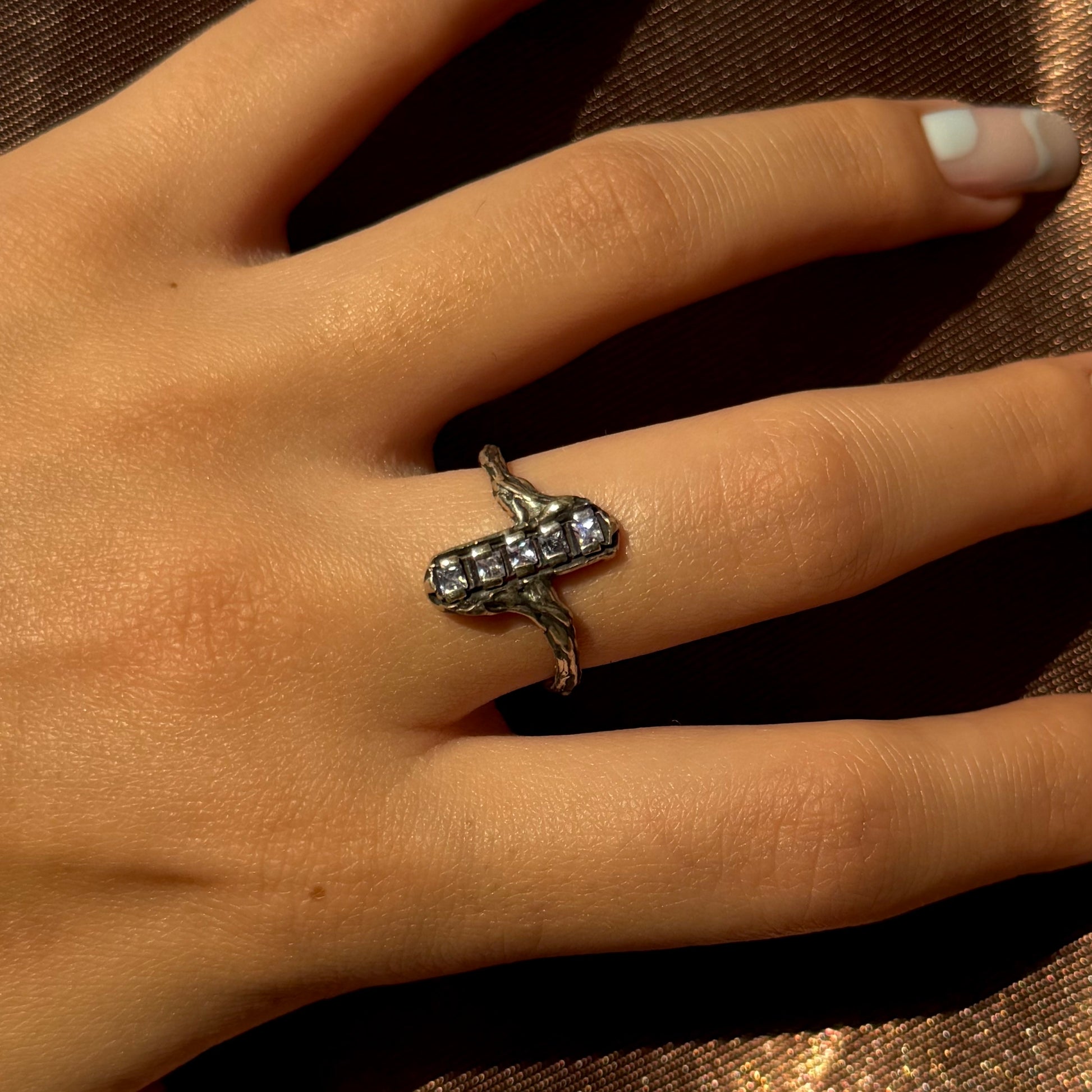 This handcrafted silver ring features a striking row of cubic zirconia, carefully set to create a radiant line of light. The organic band design adds a touch of raw artistry, making the piece both bold and refined. Each ring is individually crafted, ensuring that no two are identical — a one-of-a-kind treasure for your collection. Perfect for those who appreciate statement jewelry with elegance and personality.