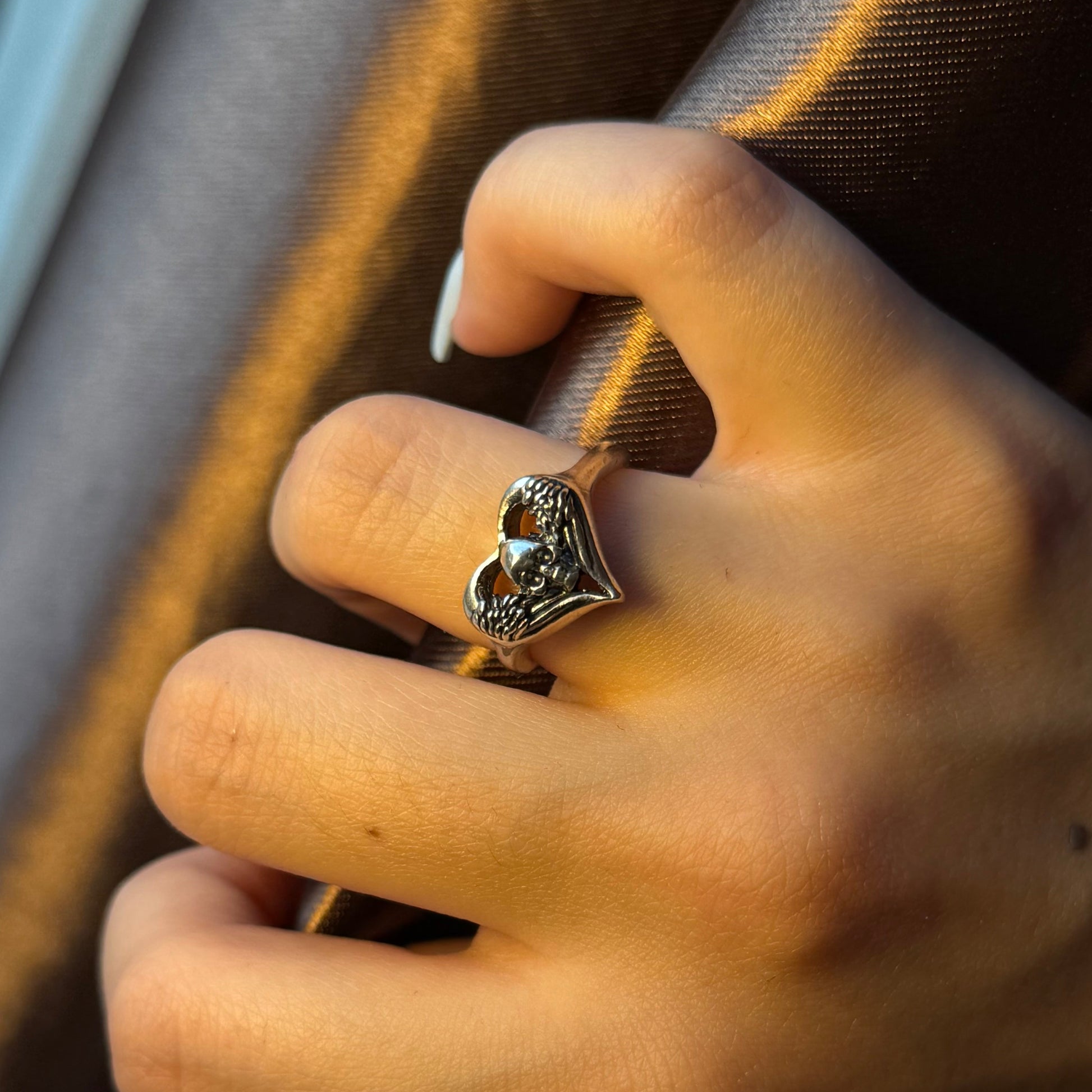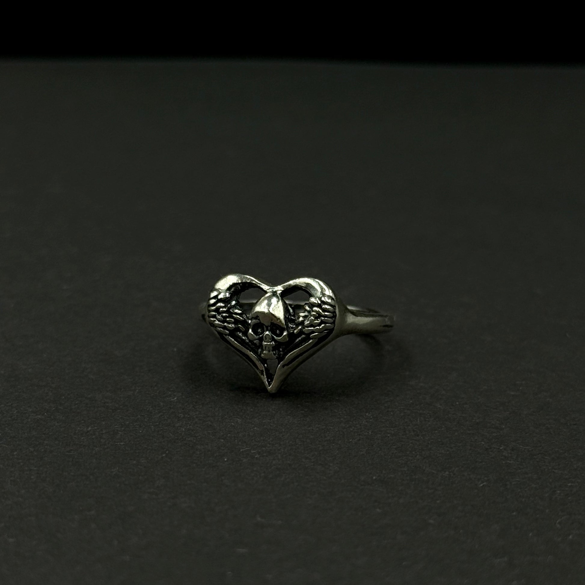 Handmade silver ring with heart-and-skull design