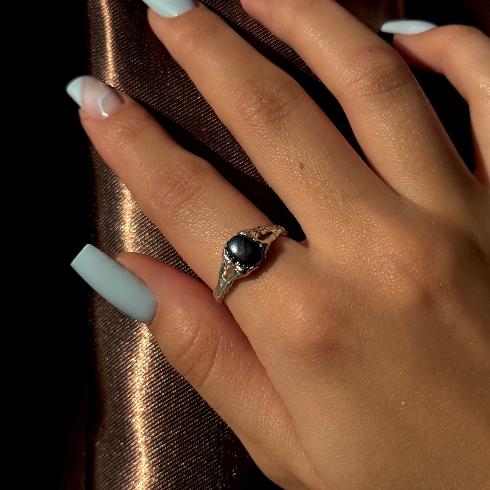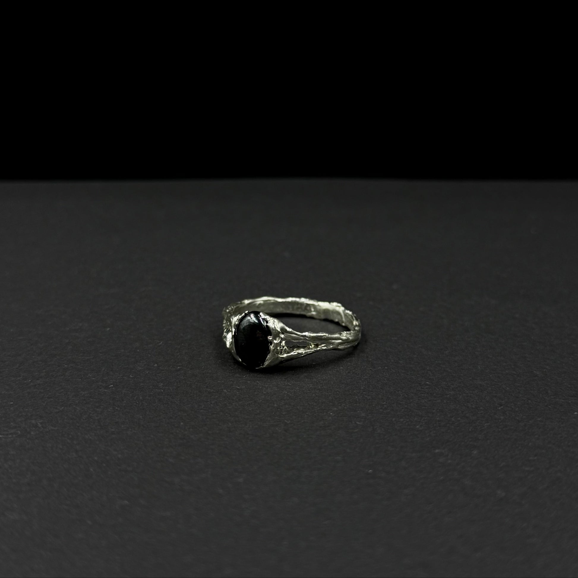 This unique handmade silver ring is adorned with natural hematite — a stone long believed to symbolize inner strength, confidence, and protection from negative energy. Its deep metallic shine gives the piece a mysterious character and emphasizes the individuality of its wearer.
