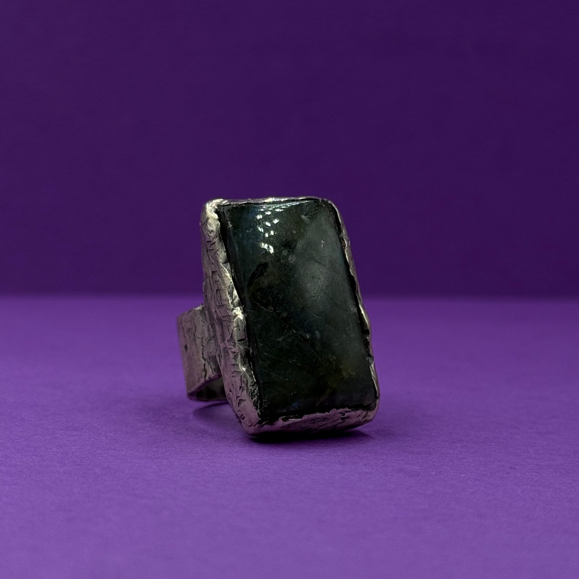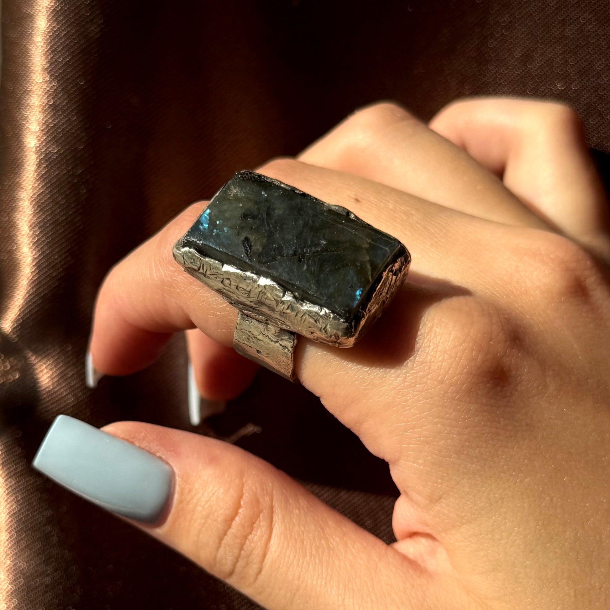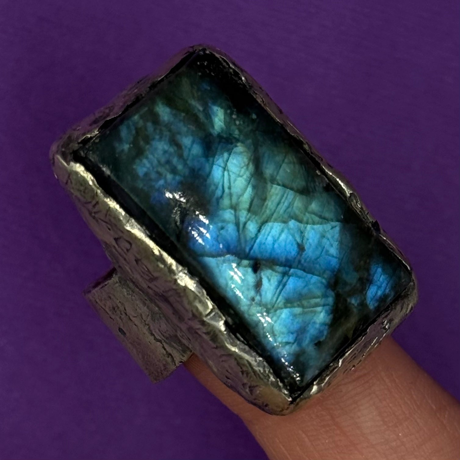 Handmade silver ring with a large natural labradorite stone. Known for its mesmerizing flashes of blue and green, labradorite is a stone of intuition, transformation, and protection. Each piece is individually crafted by hand, making this ring truly one of a kind.