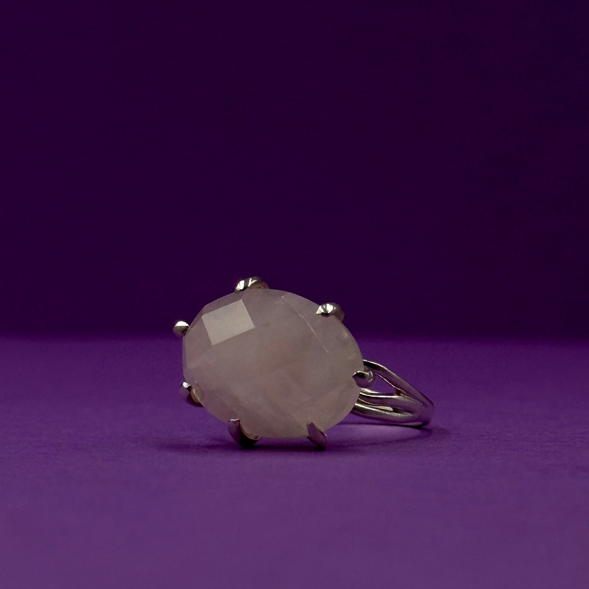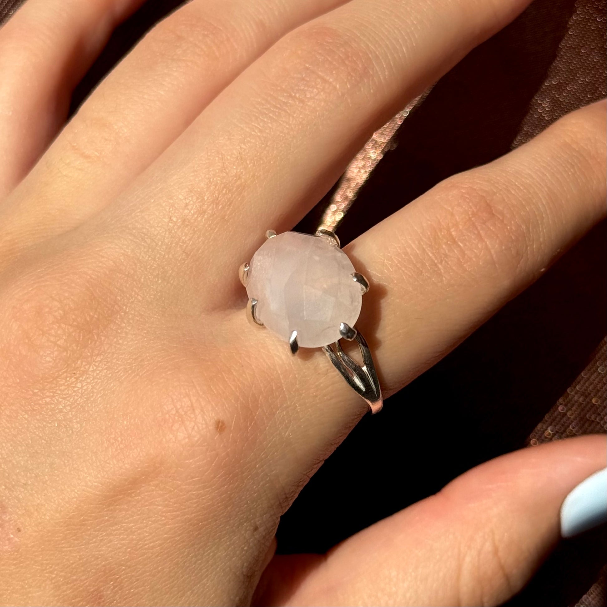 Handmade silver ring with a large natural rose quartz stone. Known as the “stone of love,” rose quartz carries gentle energy and timeless beauty. Each ring is crafted by hand, making it a unique piece with its own character and charm.