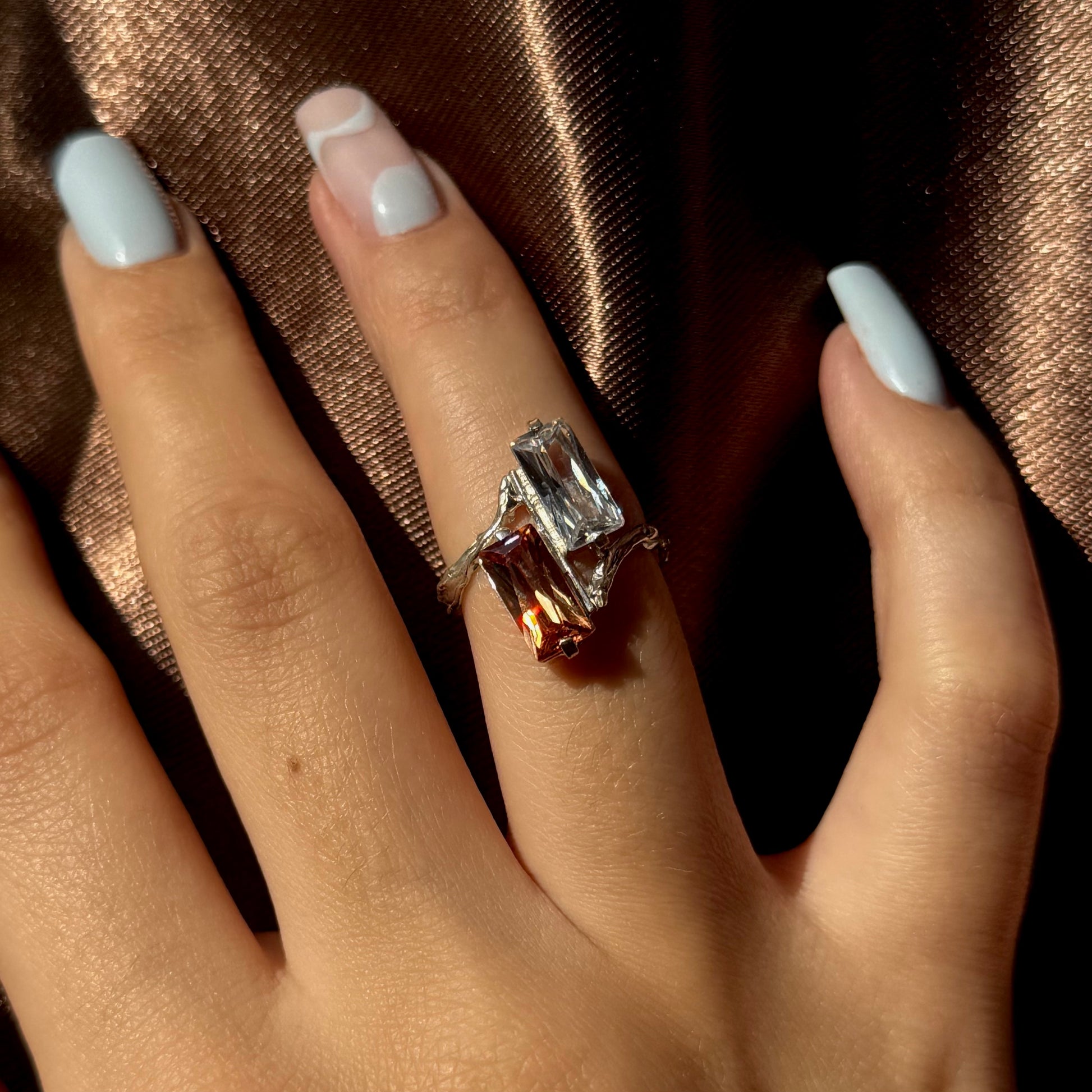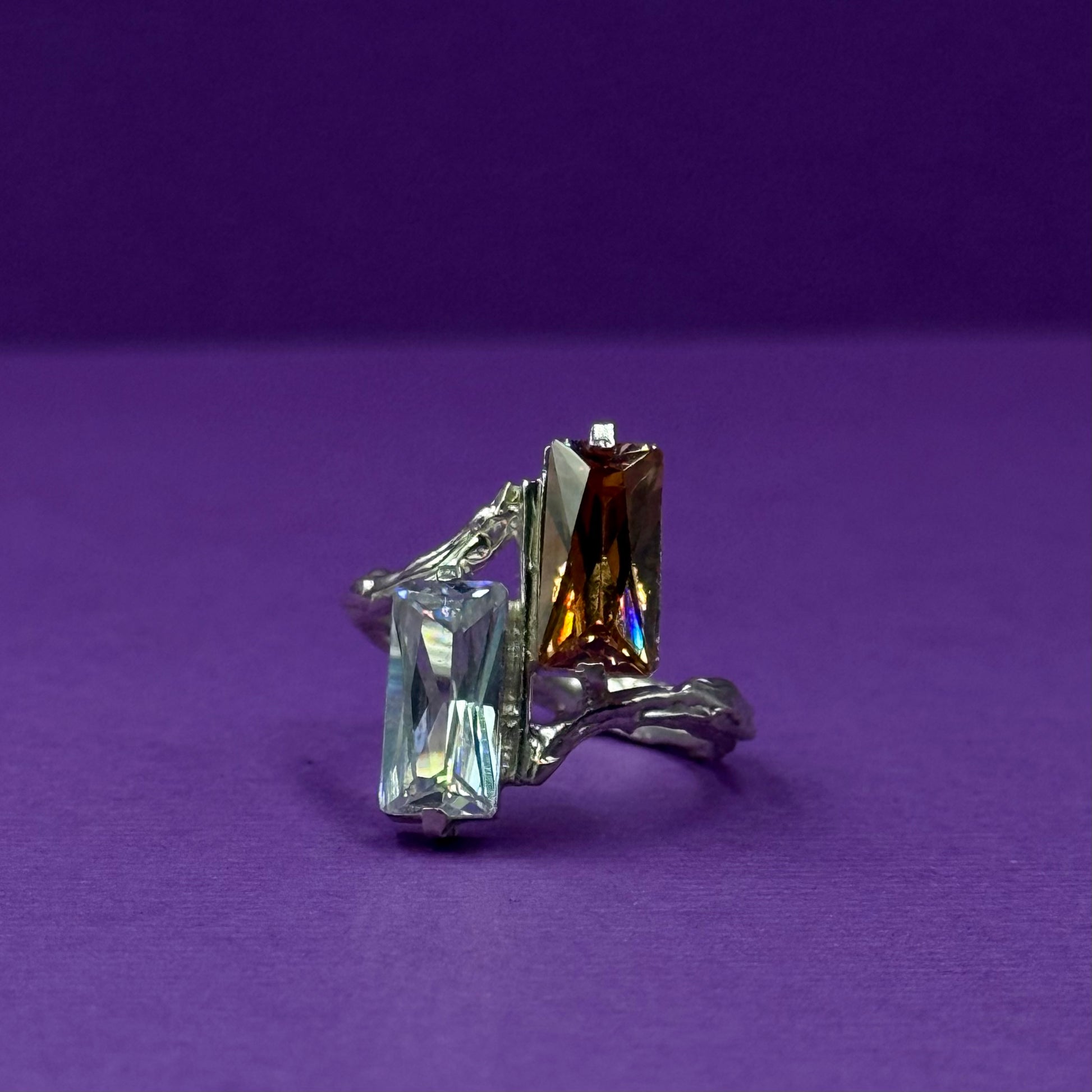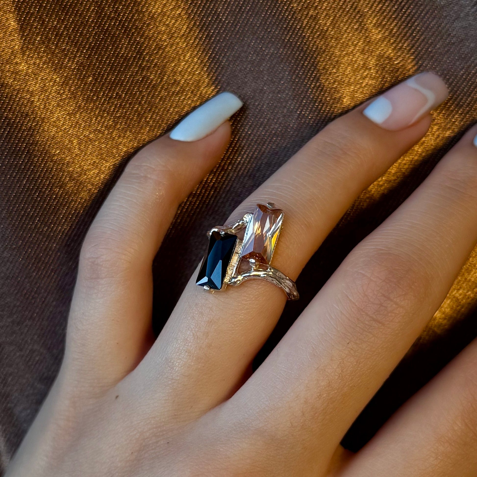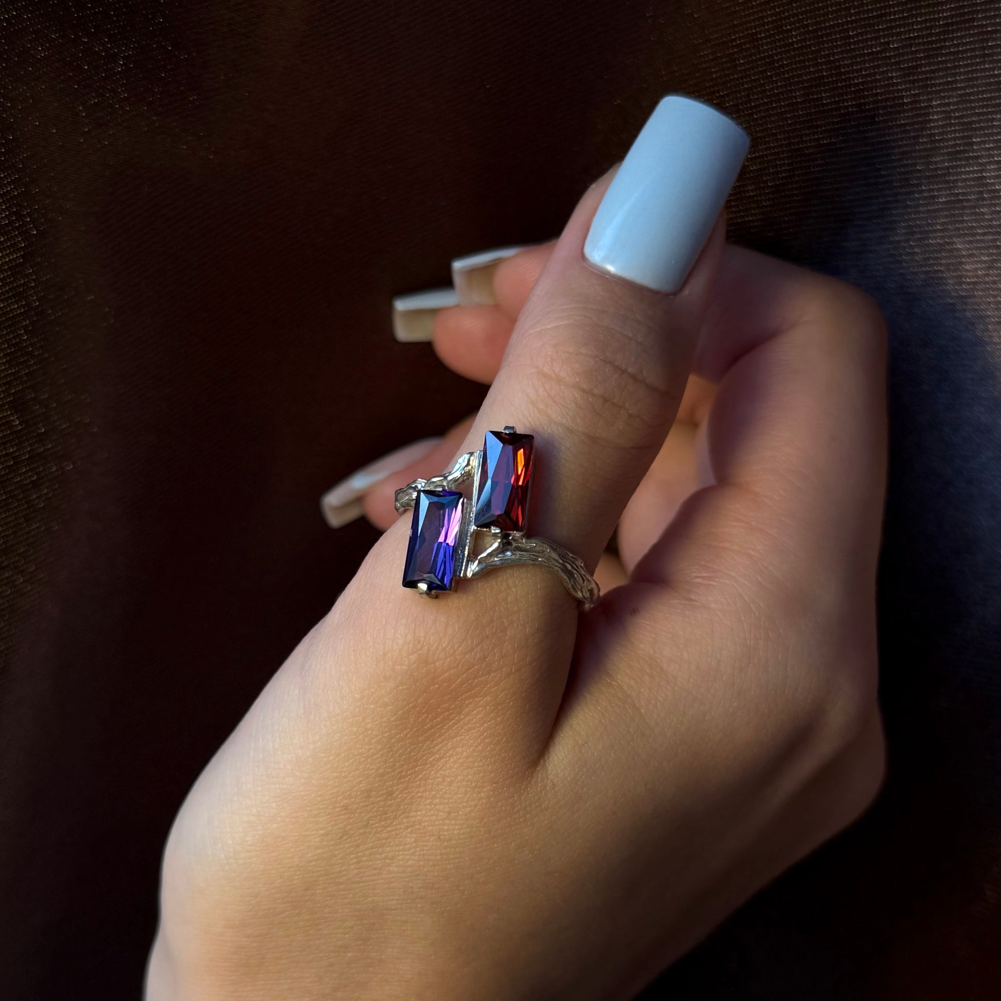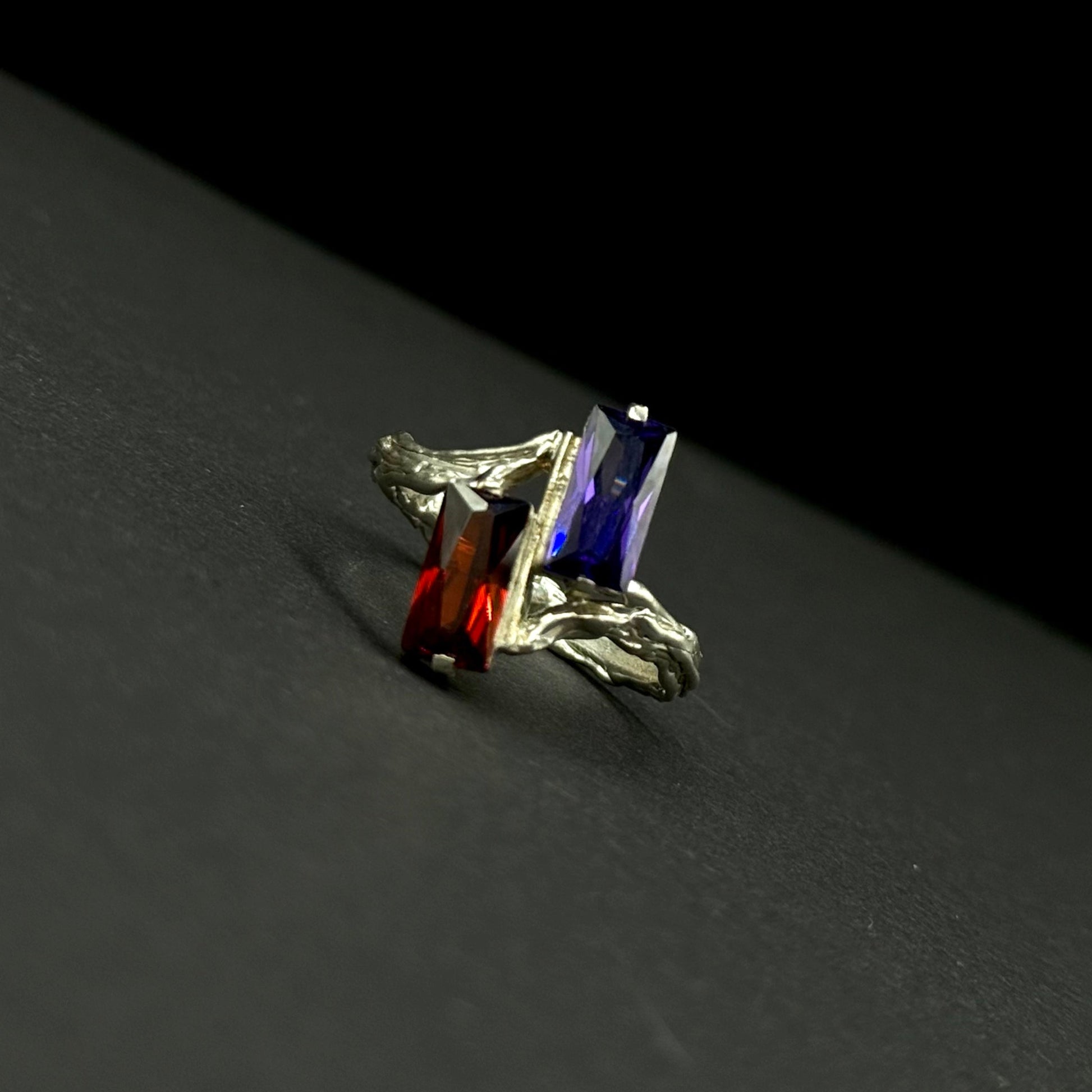 Handmade silver ring with two baguette-cut cubic zirconia stones. Bold color contrasts and organic band design make each piece unique and eye-catching. Every ring is crafted by hand, meaning no two are exactly alike — a modern statement for those who love individuality.