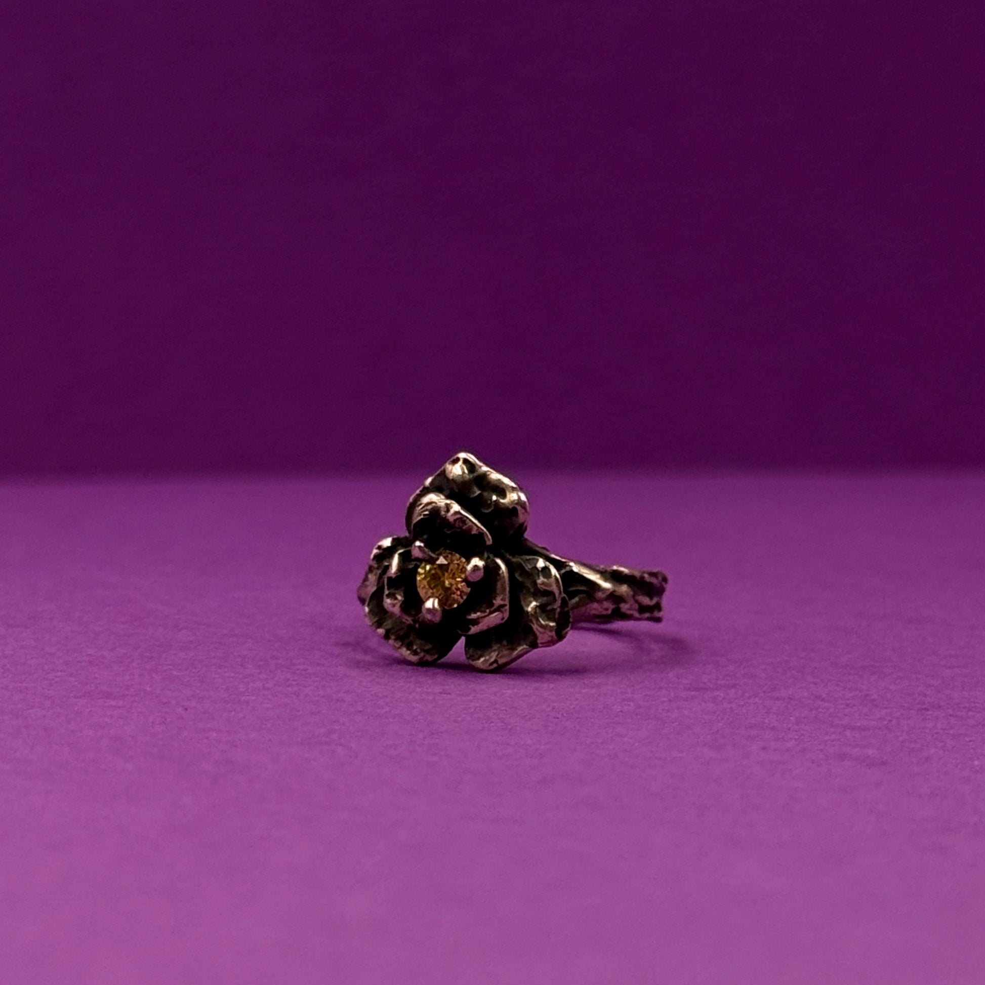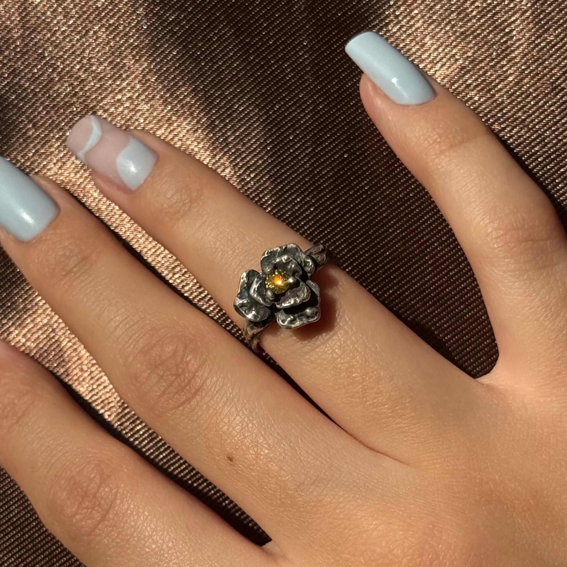 This handmade silver ring features a beautifully sculpted rose, symbolizing timeless love and elegance. At its heart shines a sparkling cubic zirconia, adding brilliance and contrast to the textured petals. Each piece is crafted individually, ensuring that no two rings are exactly alike — making it a truly unique treasure in your jewelry collection. Perfect as a romantic gift or a statement accessory, this ring embodies both artistry and meaning.
