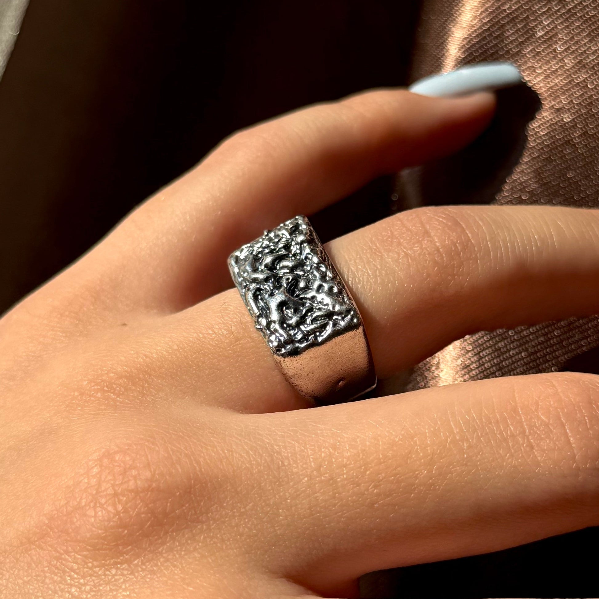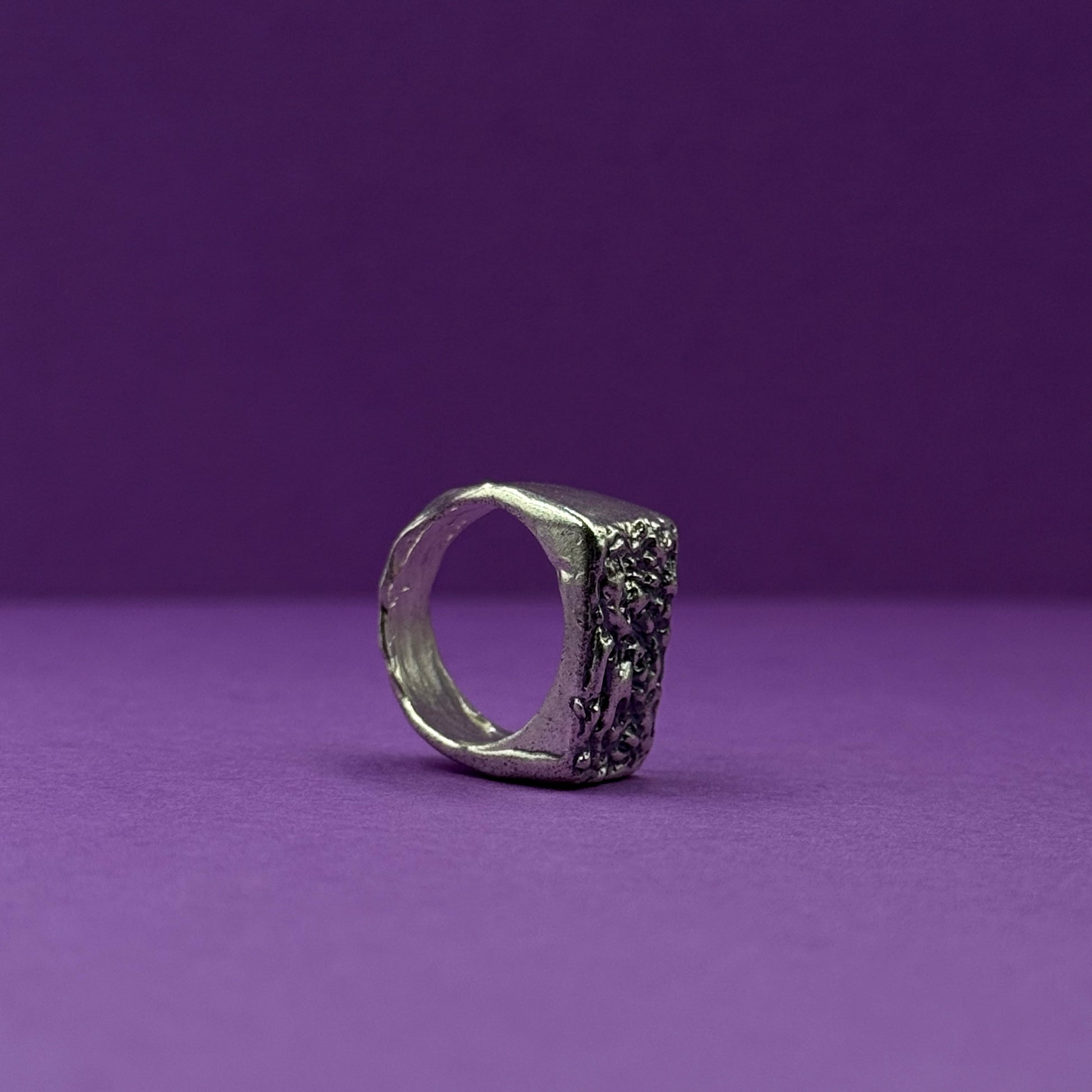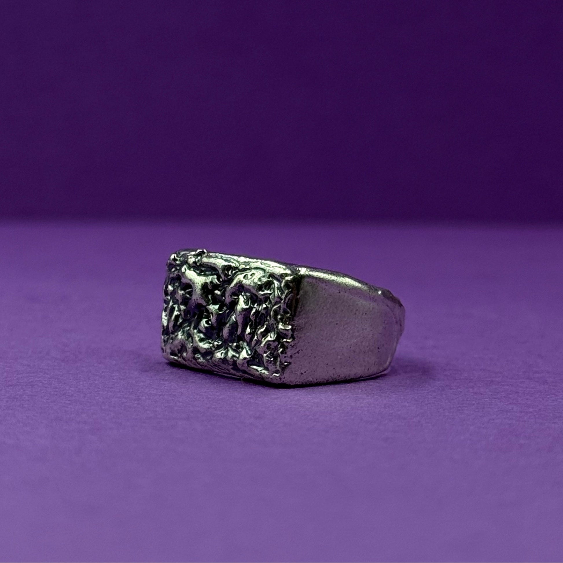 Handmade silver signet ring with a textured, raw surface design. Each piece is individually crafted, giving it a bold, rugged character. A unique one-of-a-kind statement ring for those who appreciate strength, artistry, and individuality in jewelry.