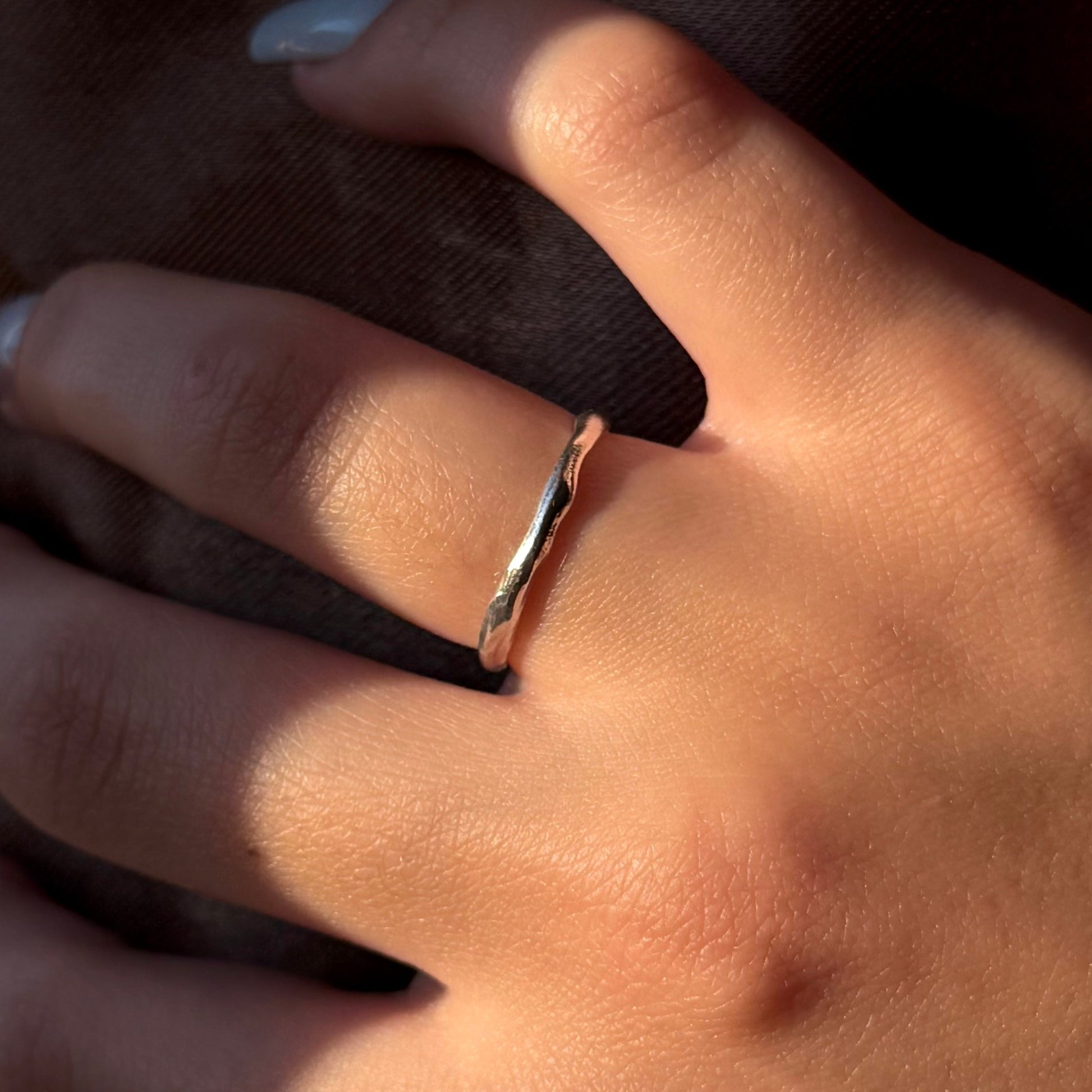 This minimalist sterling silver ring features a subtle wavy texture, adding a modern yet organic feel to the design. Its clean and elegant look makes it a versatile piece — suitable for both casual outfits and more refined styles.