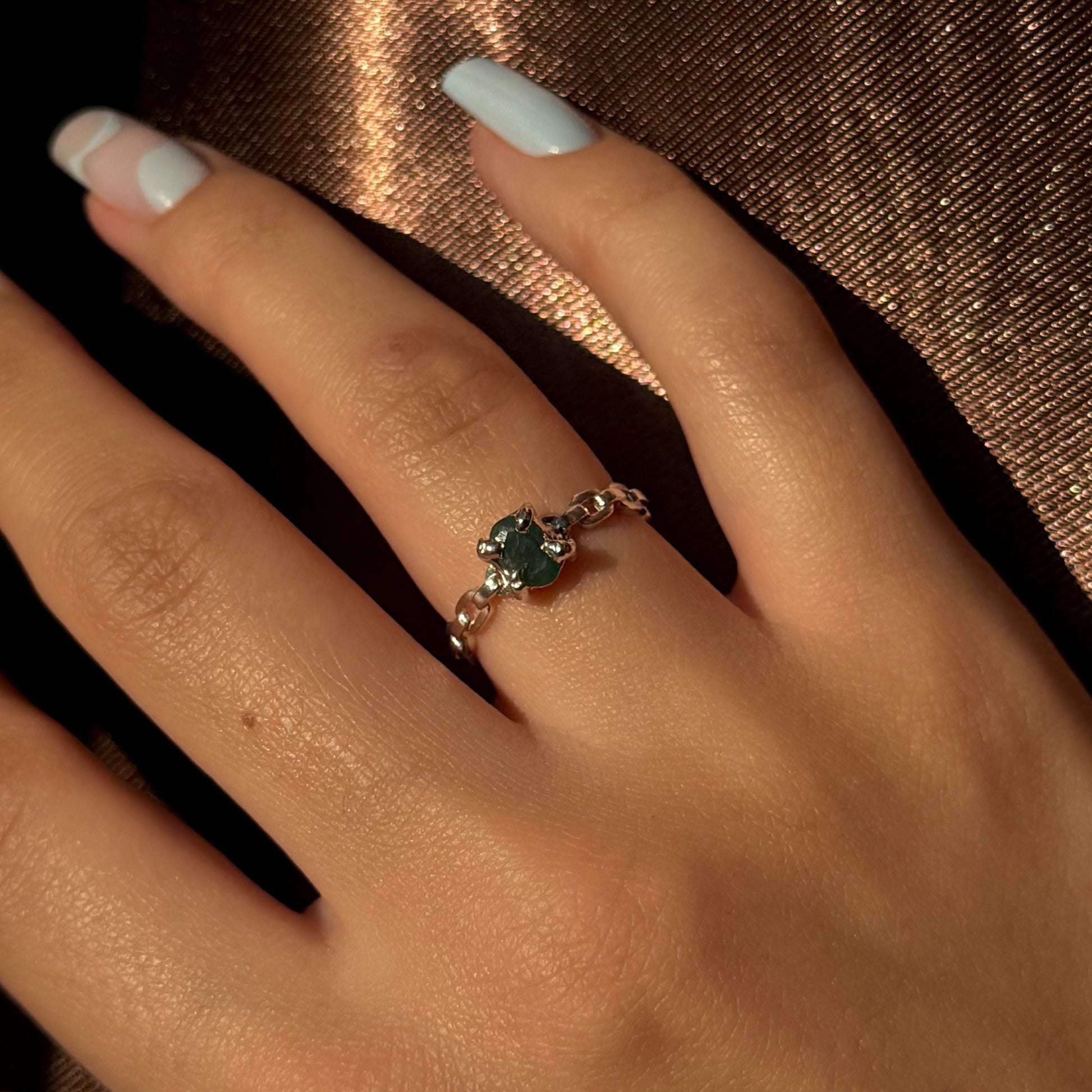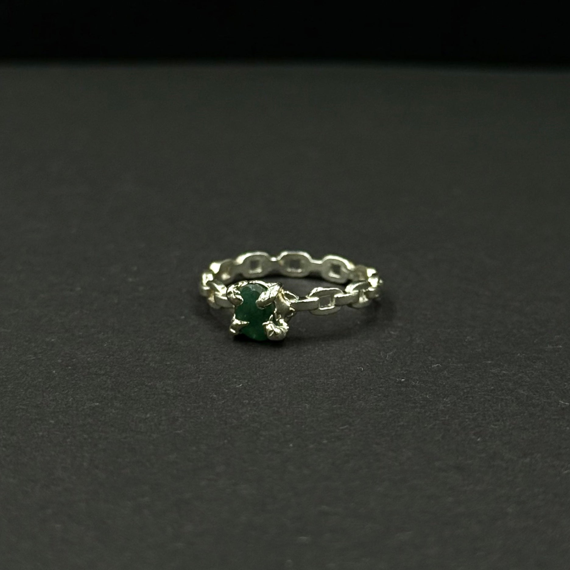 An elegant silver ring featuring an emerald — a gemstone that symbolizes harmony, wisdom, and renewal. Its deep green hue shimmers beautifully in the light, adding refined brilliance to the piece. The band is designed with subtle chain-like details, giving the ring a unique and modern touch.